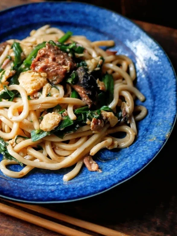 火の通りが早い冷凍うどんと、調理済みのサバ缶を組み合わせた、包丁を一度も使わない一皿です。